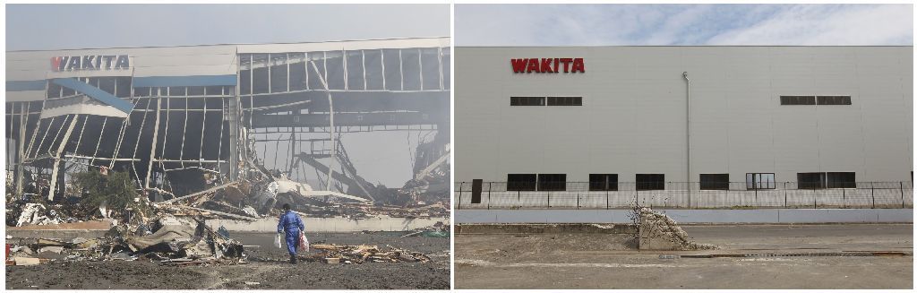 Opravena už byla i tato Sendaiská fabrika. (Snímky z 11. března a 9. září).