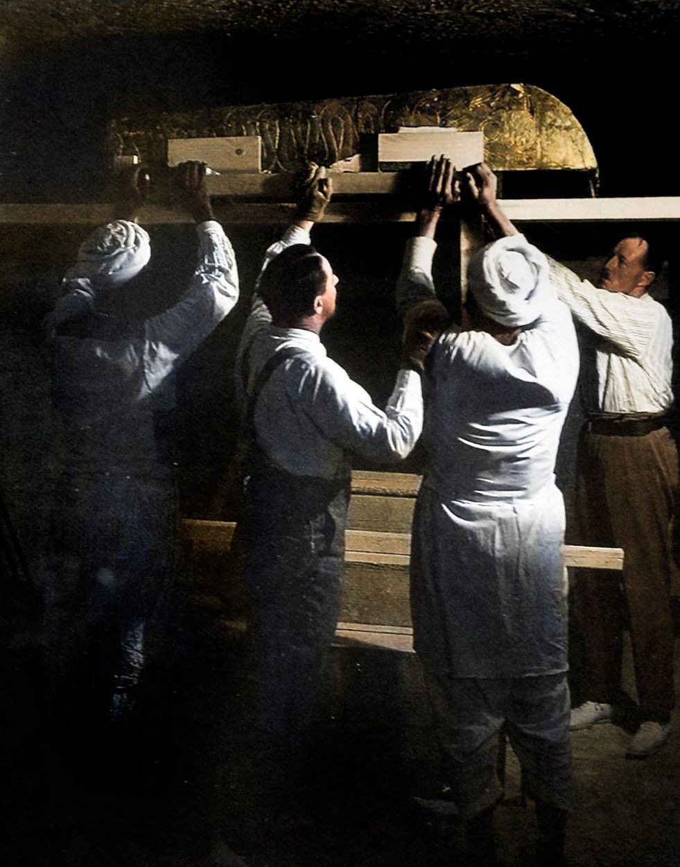 Vynášení zlata i slavnostní večeře v hrobce. Obarvené snímky z objevení Tutanchamona