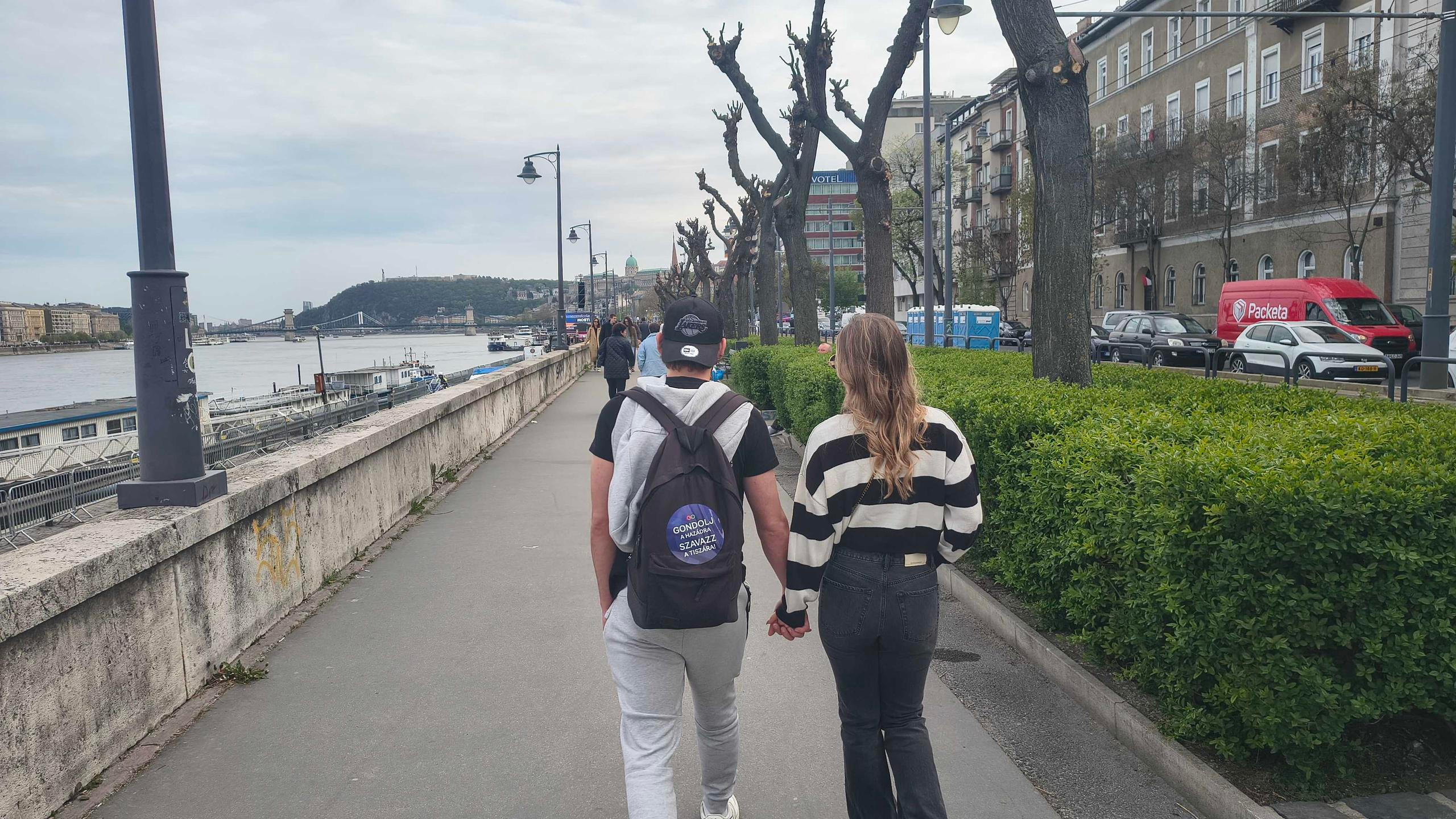 Ještě před uzavřením volebních místností se lidé začali scházet na náměstí Batthyány tér, kde má svůj volební štáb opoziční Tisza. 12. dubna 2026, Budapešť.