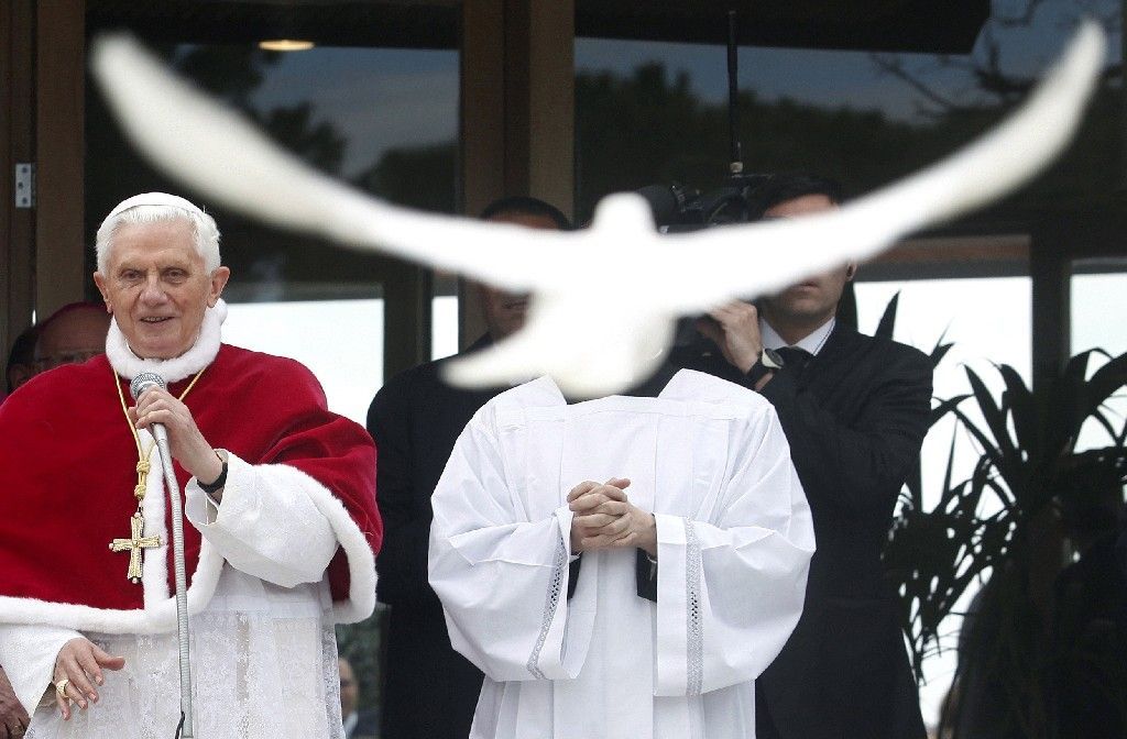 Holubice, symbol míru, letí vstříc Benediktu XVI.