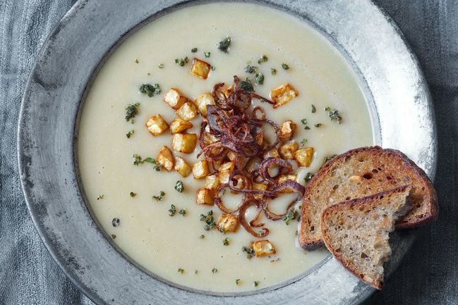 Hrachová kaše se smaženým celerem.